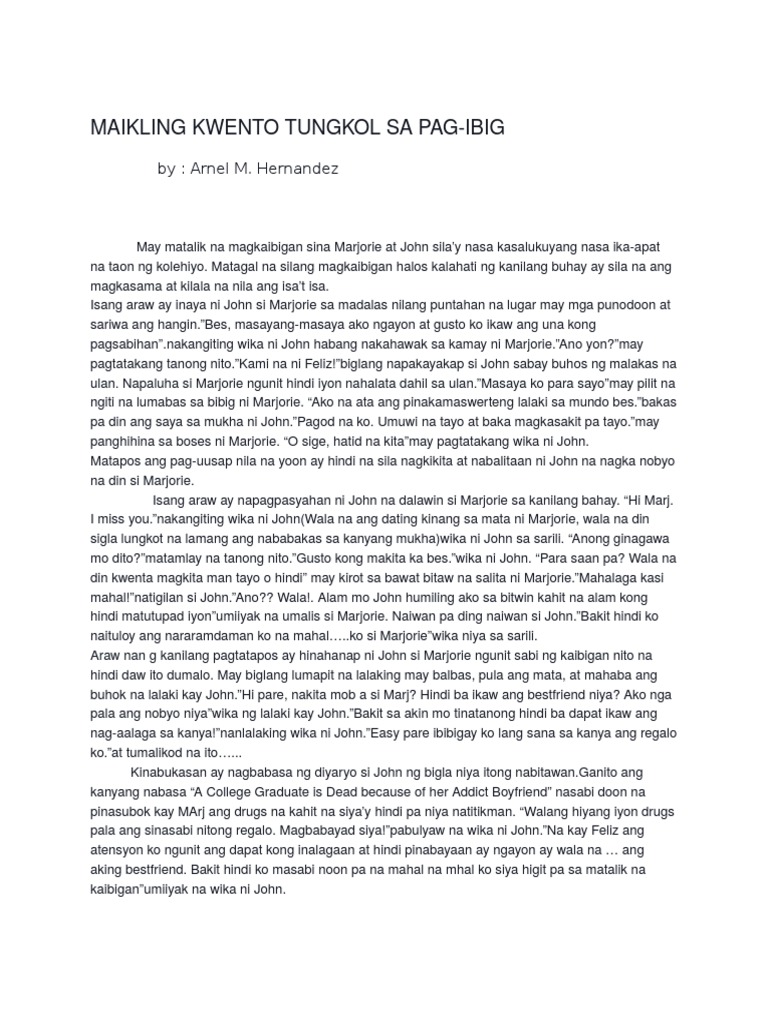 Mga Halimbawa ng Maikling Kwento Tungkol sa Pag-ibig. Ang mga mata ng dalagay kumikinang-kinangang titig niya sa binatay nakahihibangmga ngitiy sintamis ng nararamdamang pag-iibigantanging ang sagot ng dalaga lamang ang inaasamAng tingin ng lahat ay nasa kanilatila ba parang artista na inaabangan ang ending ng pelikulaMakalipas ang ilang minutong paghihintay ng. Halimbawa ng sanaysay tungkol sa aking pamilya Tulad na lamang ng isang simpleng pangarap ng bawat OFW na makapagpadala ng pera sa kaniyang pamilya.