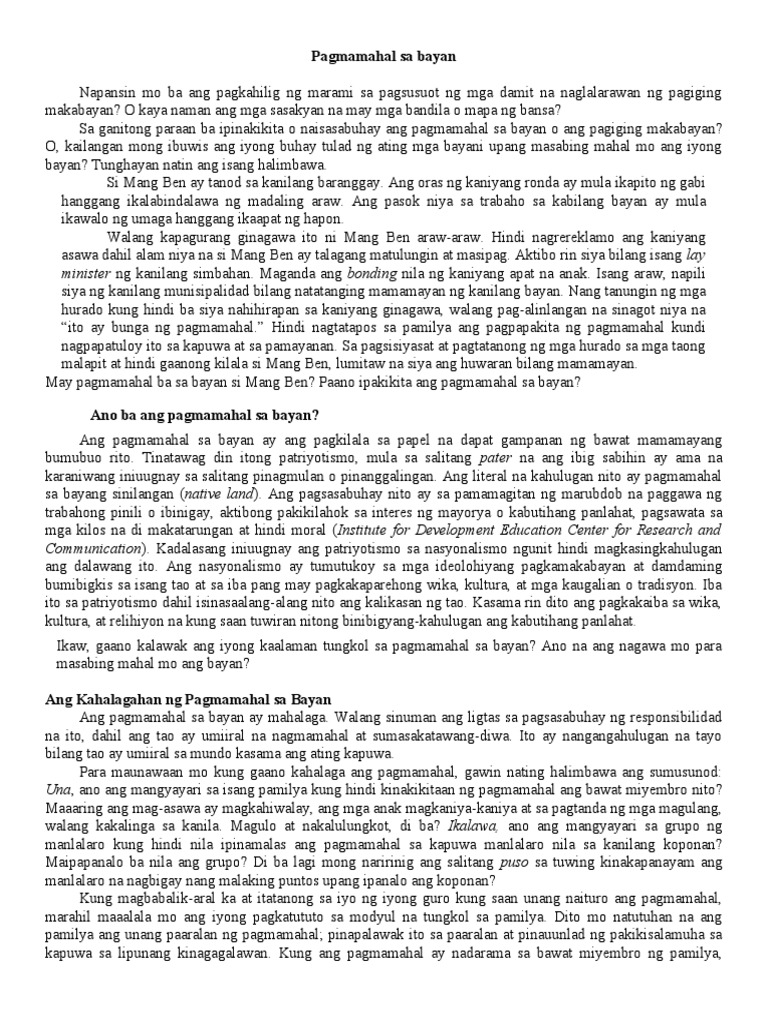 Lahat tayo kahit kabataan ay dapat may pagmamahal sa bayan dahil kung wala tayo nito ay daig pa natin ang hayop at malansang isda katulad ng sinabi ni Dr. Ano ang ibig sabihin ng pagamamahal sa bayan. Mga dahilan na ipagmalaki natin ang sarili nating bayan.
